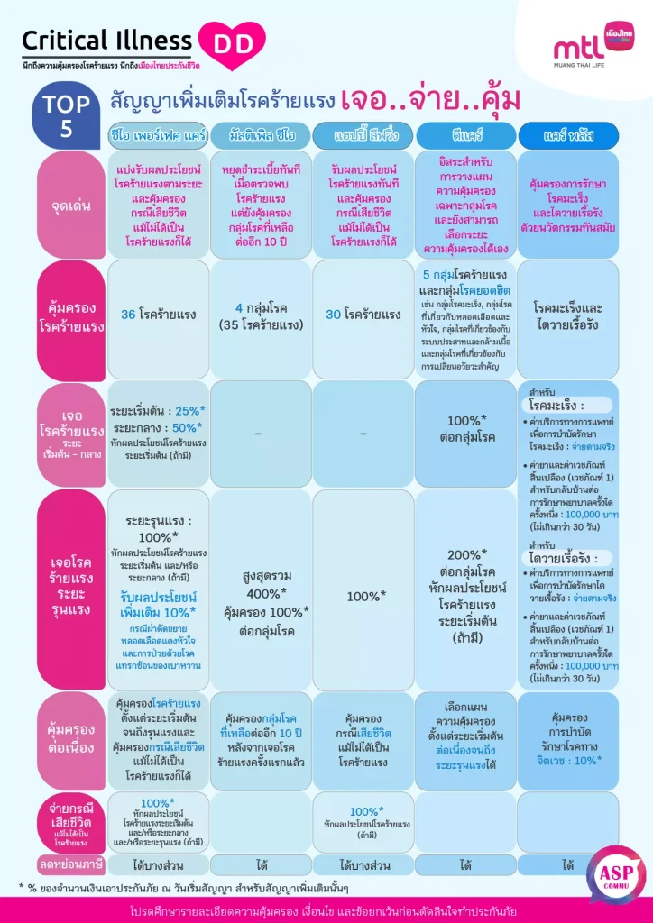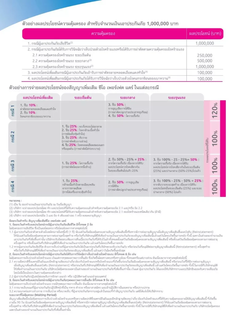 – คุ้มครองเสียชีวิตหรือตรวจเจอโรคร้ายแรงทุกระยะ เช่นระยะเริ่มต้น 25% – ระยะกลาง 50% – ระยะสุดท้าย 100% อย่างใดอย่างหนึ่ง