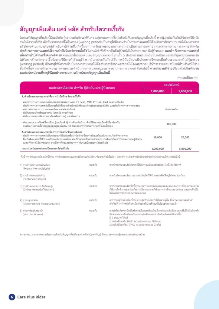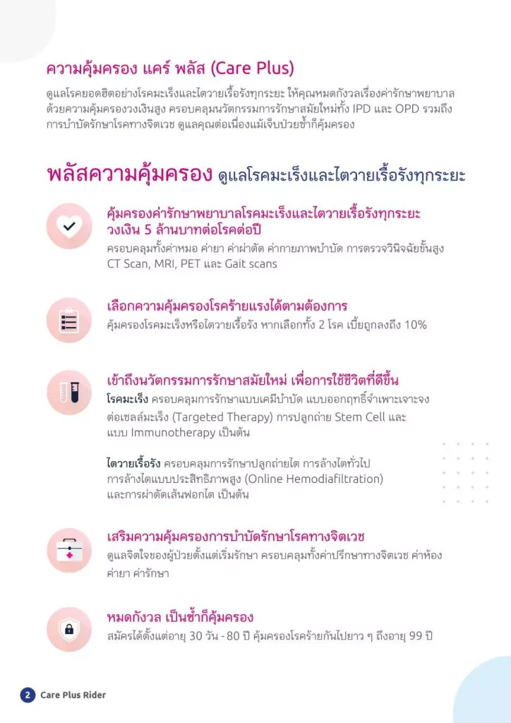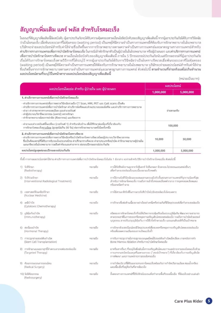 1. ประกันโรคร้ายแรงแคร์พลัส มะเร็ง และไตวายเรื้อรัง 5 ล้านบาทต่อปี (จ่ายเป็นค่ารักษาพยาบาลให้กับโรงพยาบาล)