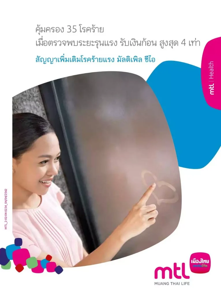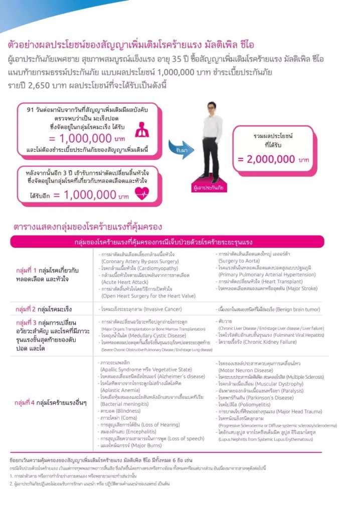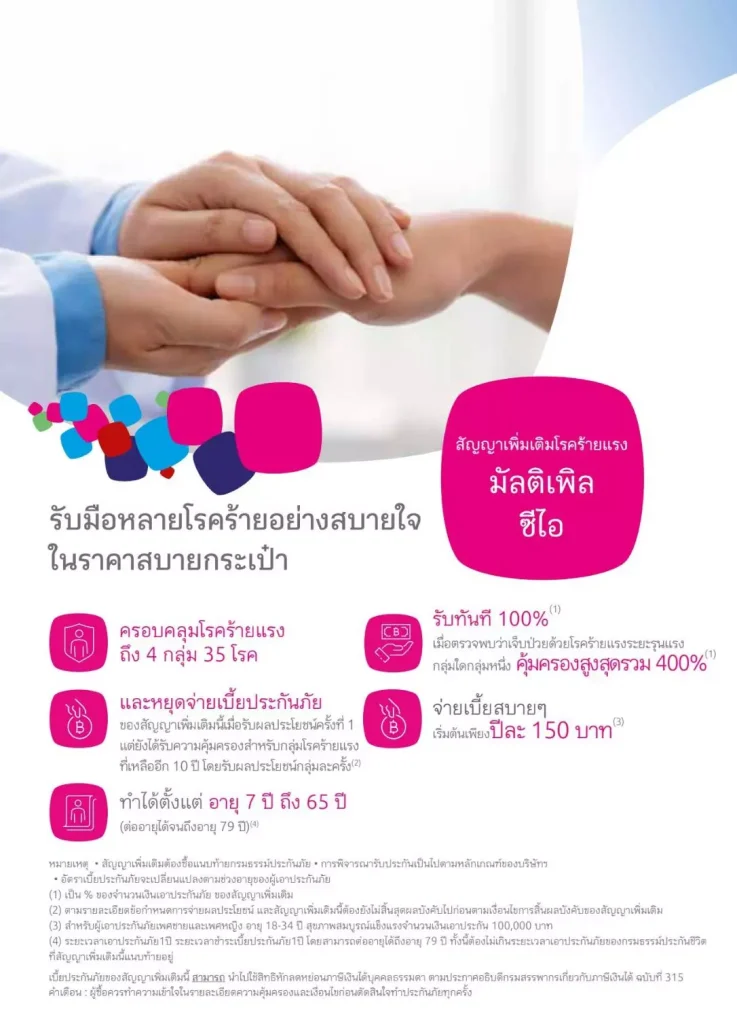 3. ประกันโรคร้ายแรงมัลติเพิลซีไอ 4 กลุ่ม 35 โรค (จ่ายเป็นเงินก้อนให้กับผู้ทำประกัน เจอ จ่าย ไม่จบ )