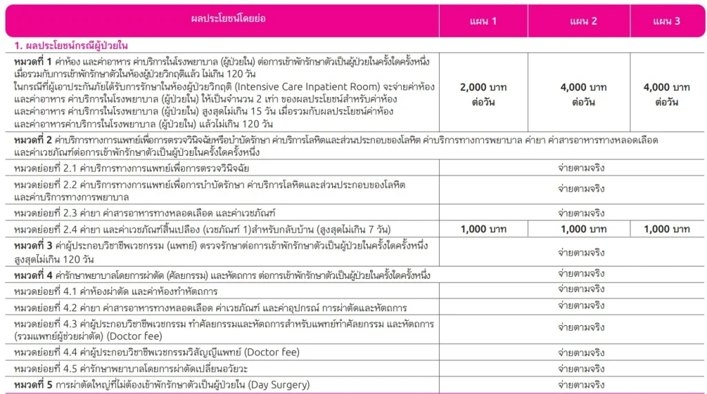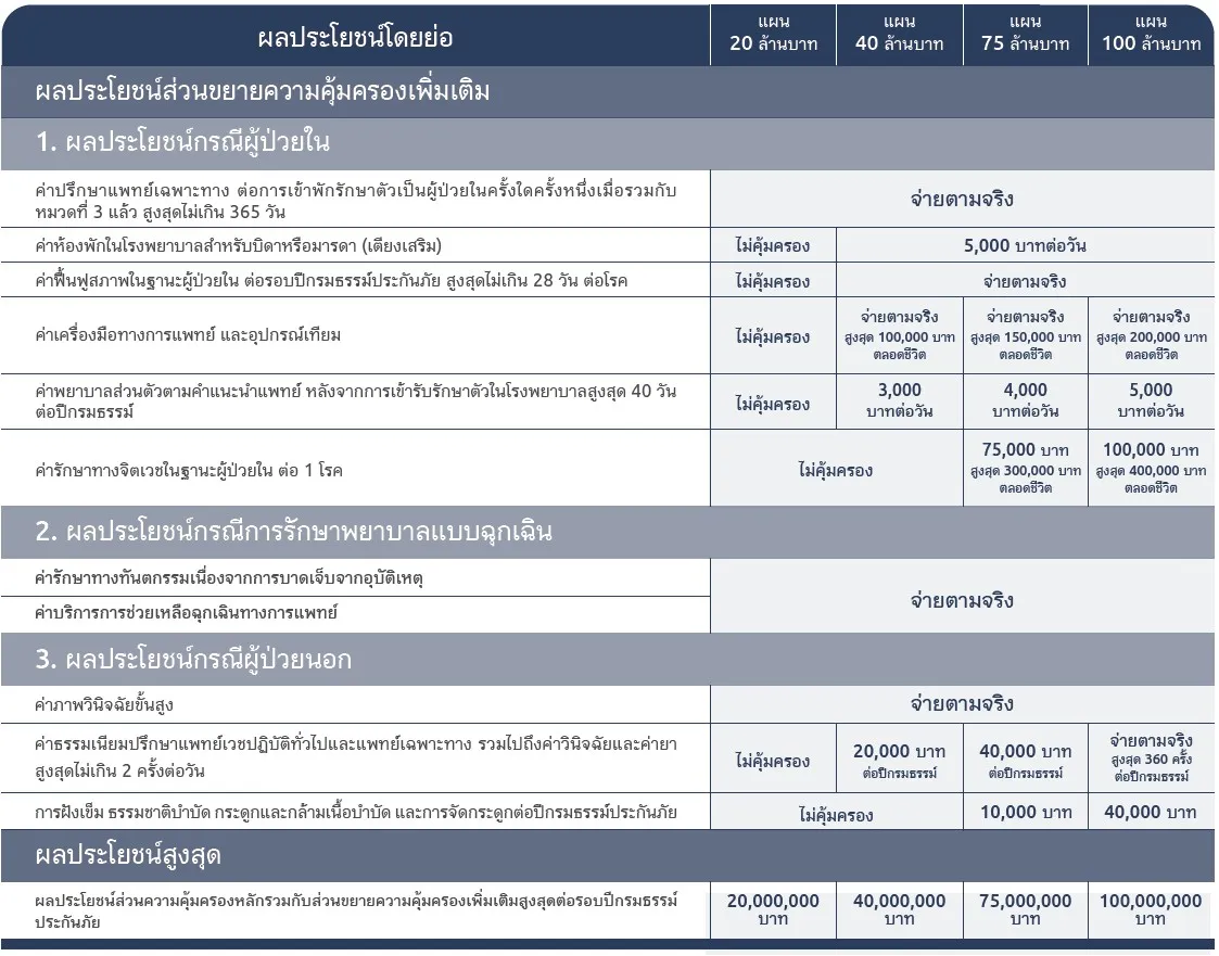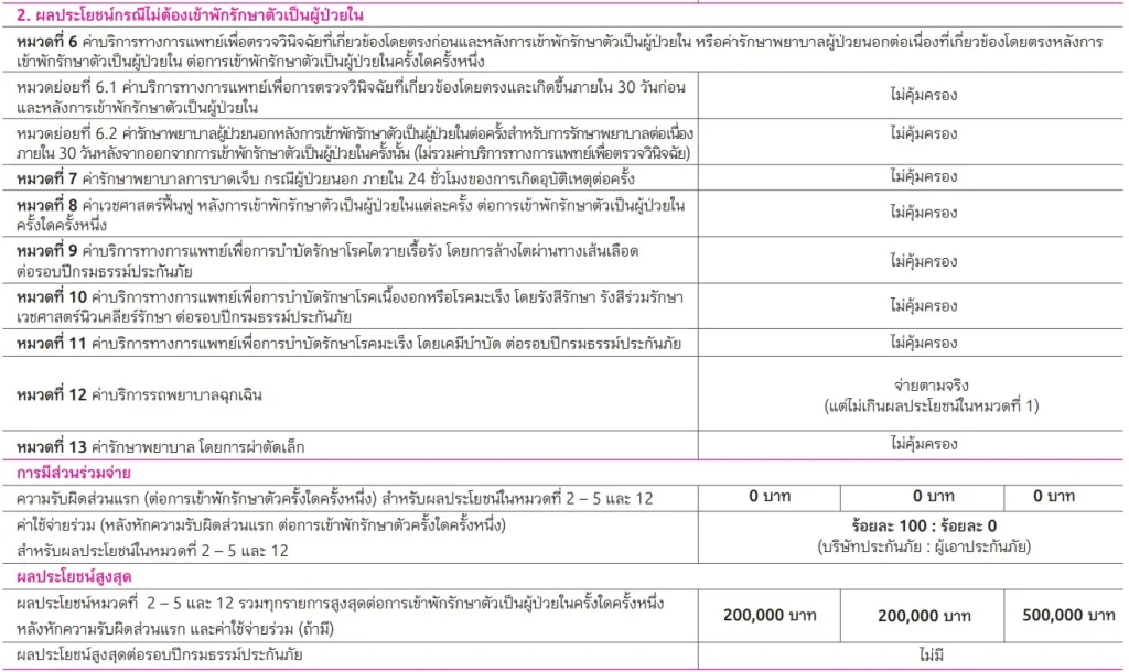 – เหมาจ่ายค่ารักษาพยาบาลครั้งละ 2 – 5 แสนบาท ไม่จำกัดวงเงินต่อปี