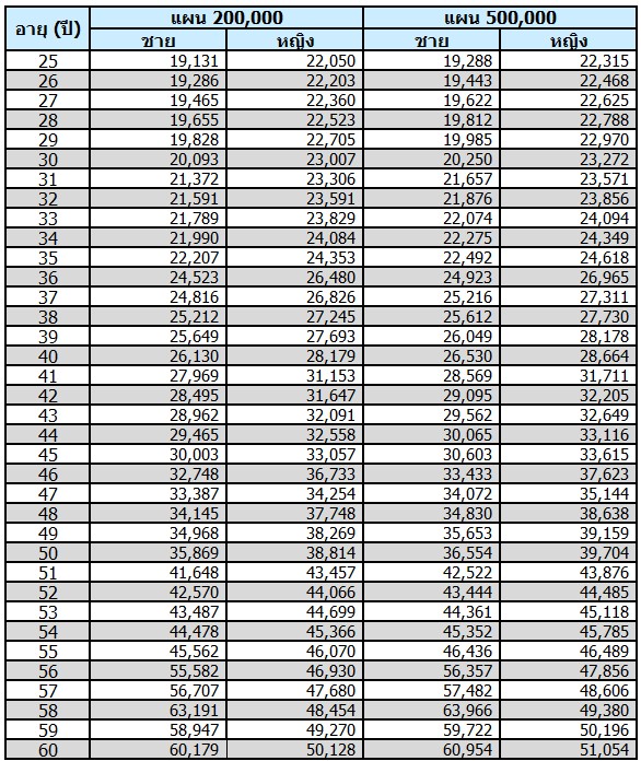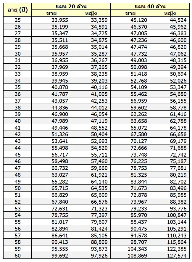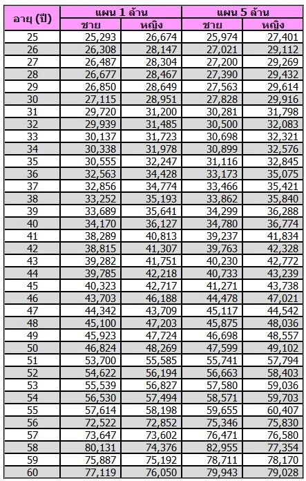 ตัวอย่างเบี้ยประกันสุขภาพอีลิทเฮลท์พลัส แผน 1 คุ้มครอง 20 ล้านบาทต่อปี