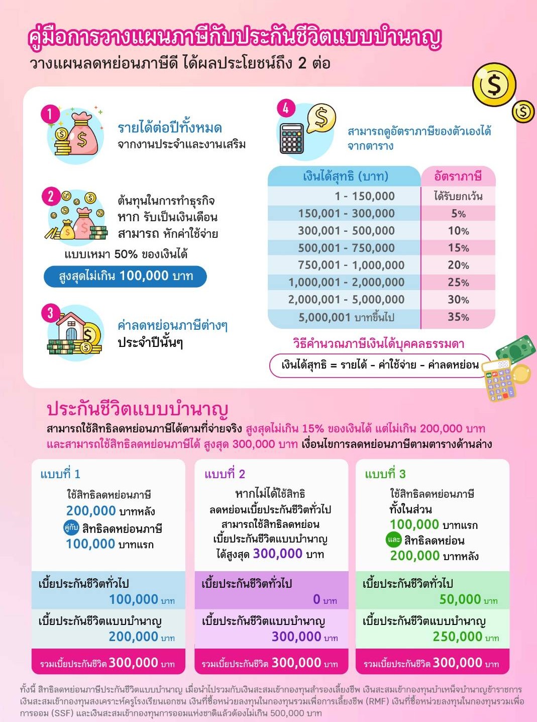 พร้อมเบี้ยประกันนำไปลดหย่อนภาษีได้ 200,000 บาท สูงสุด 300,000 บาท (กรณีไม่ใช้สิทธิ์ลดหย่อนภาษี 100,000 บาทแรก)