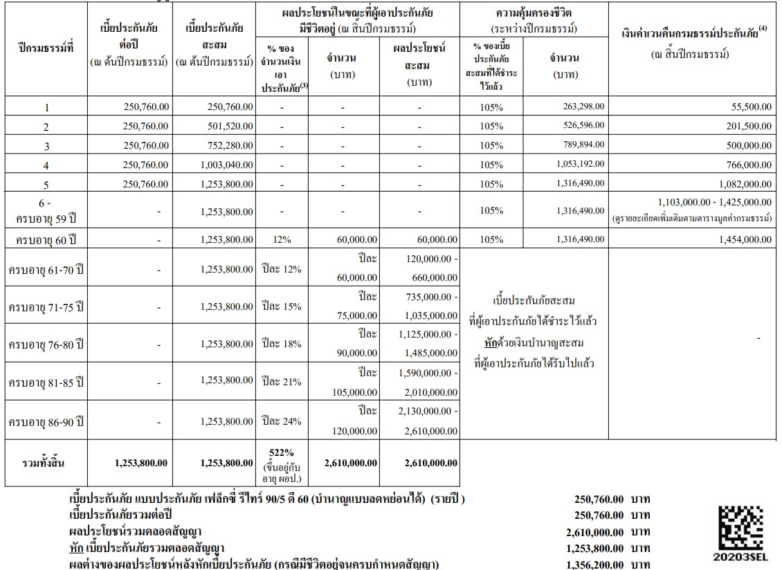 ชำระเบี้ยปีละ 250,760 บาท รวม 1,253,800 บาท กรณีรับบำนาญถึงอายุ 90 ปี รับเงินบำนาญมากกว่าเบี้ยประกันที่จ่าย 1,356,200 บาท