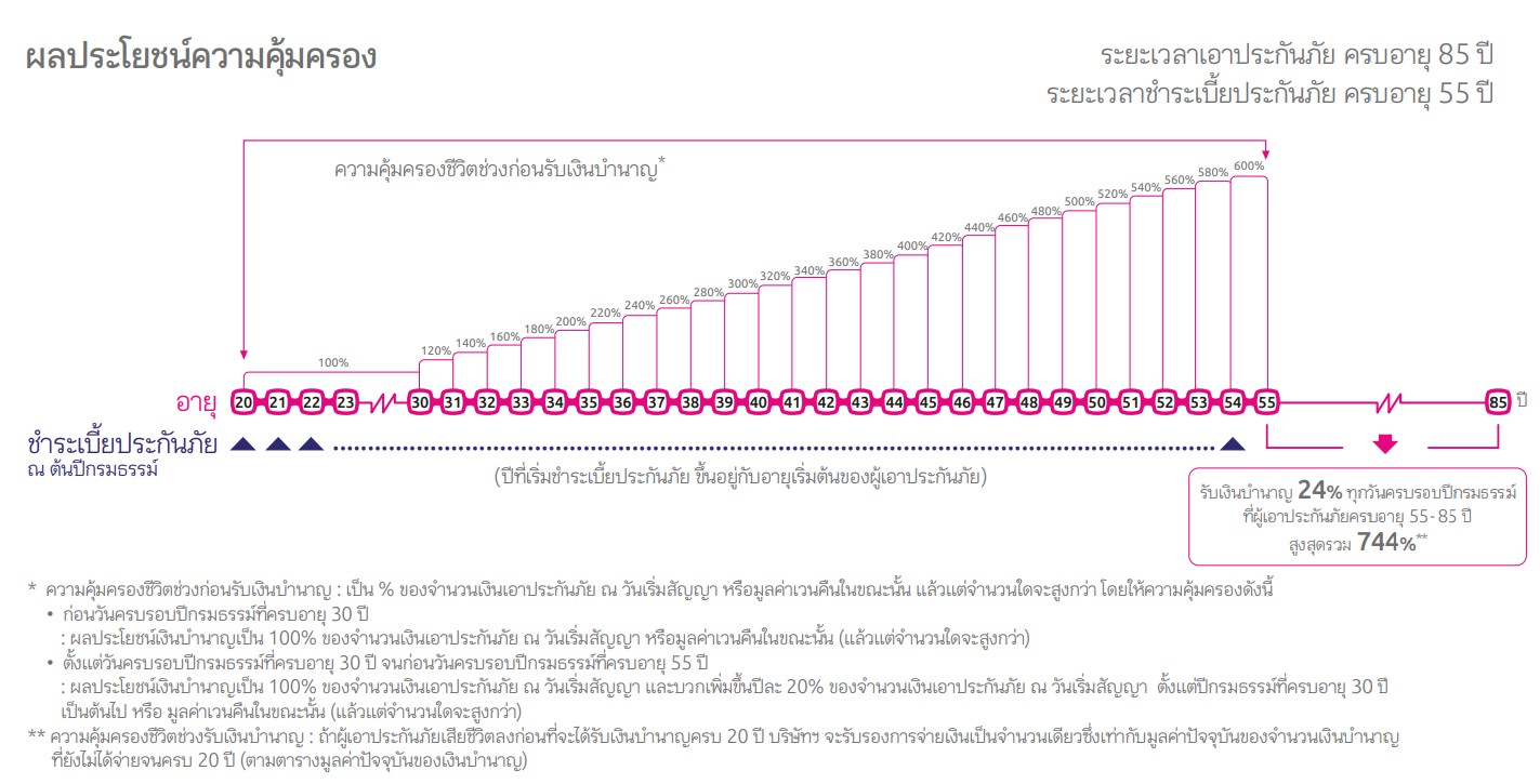 วางแผนเกษียณ และวางแผนภาษี ด้วยประกันชีวิตแบบบำนาญ 8555 จี 20 รับบำนาญปีละ 20% ตั้งแต่อายุ 55-85 ปี การันตีรับบำนาญสูงสุด 20 ปี